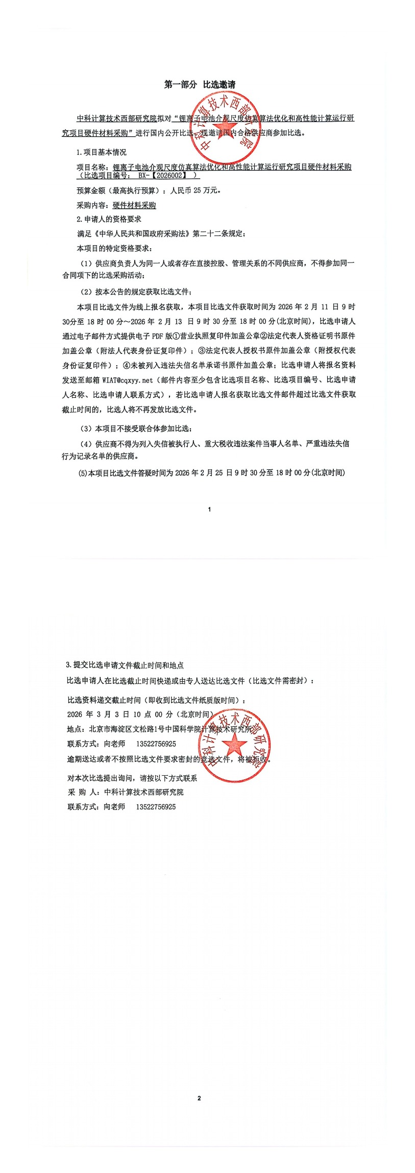 锂离子电池介观尺度仿真算法优化和高性能计算运行研究项目硬件材料采购公告