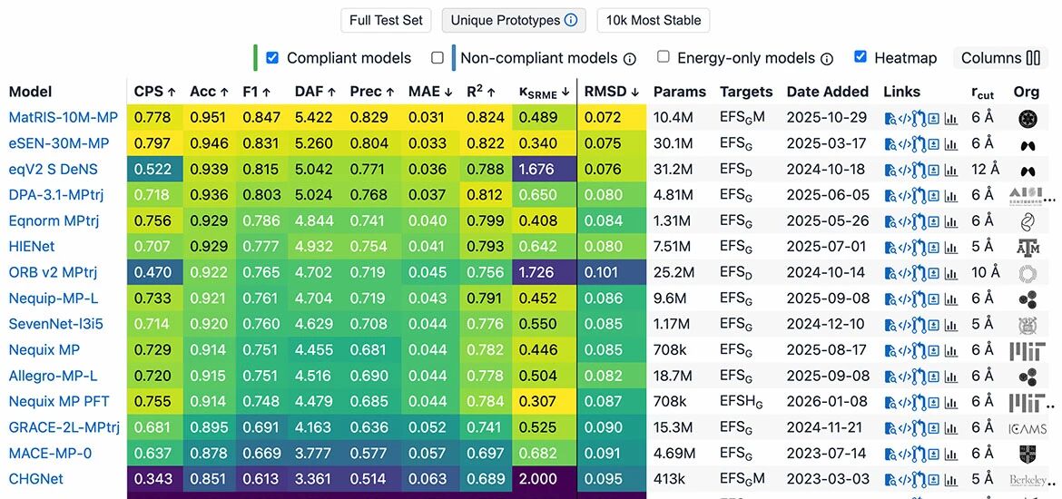 Matbench Discovery 是由加州大学伯克利分校、剑桥大学等顶尖科研机构发起的全球AI驱动无机材料发现领域最具影响力的动态基准榜单,被公认为评价材料科学智能模型性能的国际金标准。该榜单摒弃了简单的静态数据拟合,通过前瞻性测试机制要求模型预测数十万种未知晶体的热力学稳定性,真实模拟了科研探索过程。其评价体系不仅关注能量预测精度,更引入F1 分数和发现加速因子(DAF)来科学衡量筛选效率,吸引了包括 Meta、微软及顶尖高校在内的最强模型在此同台竞技,引领着科学智能领域的技术风向。